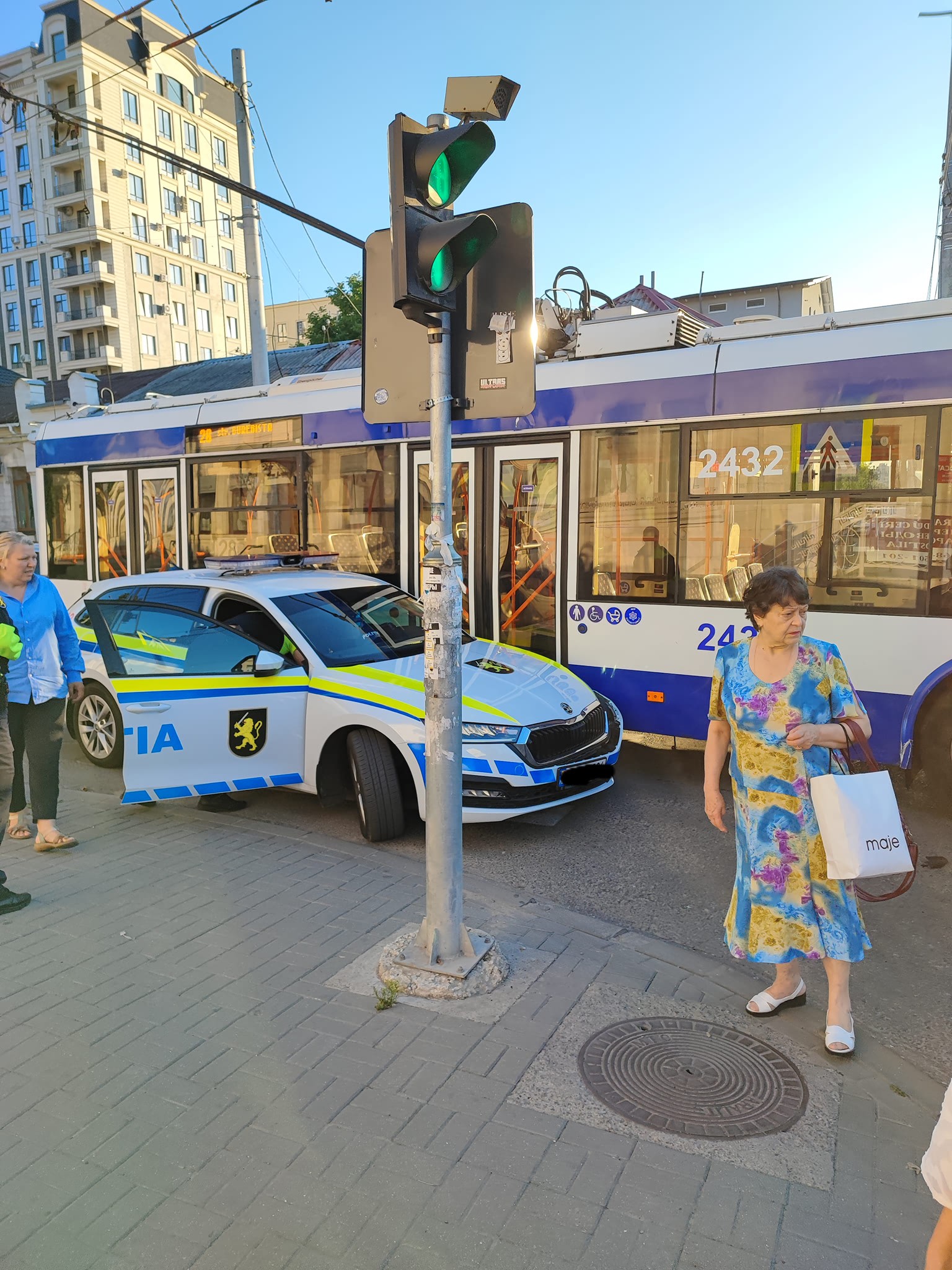 Accident matinal în Capitală. O mașină a poliției s-a lovit cu un troleibuz la intersecția străzilor Columna și V. Alecsandri. Ofițerul de presă al Poliției Capitalei, Cristina Talpă, ne-a comunicat că nu au fost înregistrate victime.