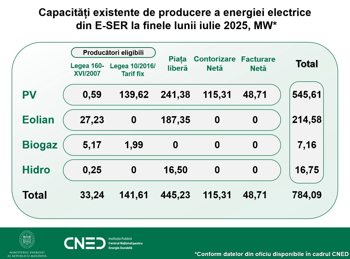 La sfârșitul lunii iulie 2025, capacitatea totală instalată de energie din surse regenerabile a atins 784,09 MW. Este vorba de o creștere de 204,7 MW față de finele anului trecut. Datele au fost prezentate de Centrul Național pentru Energie Durabilă.