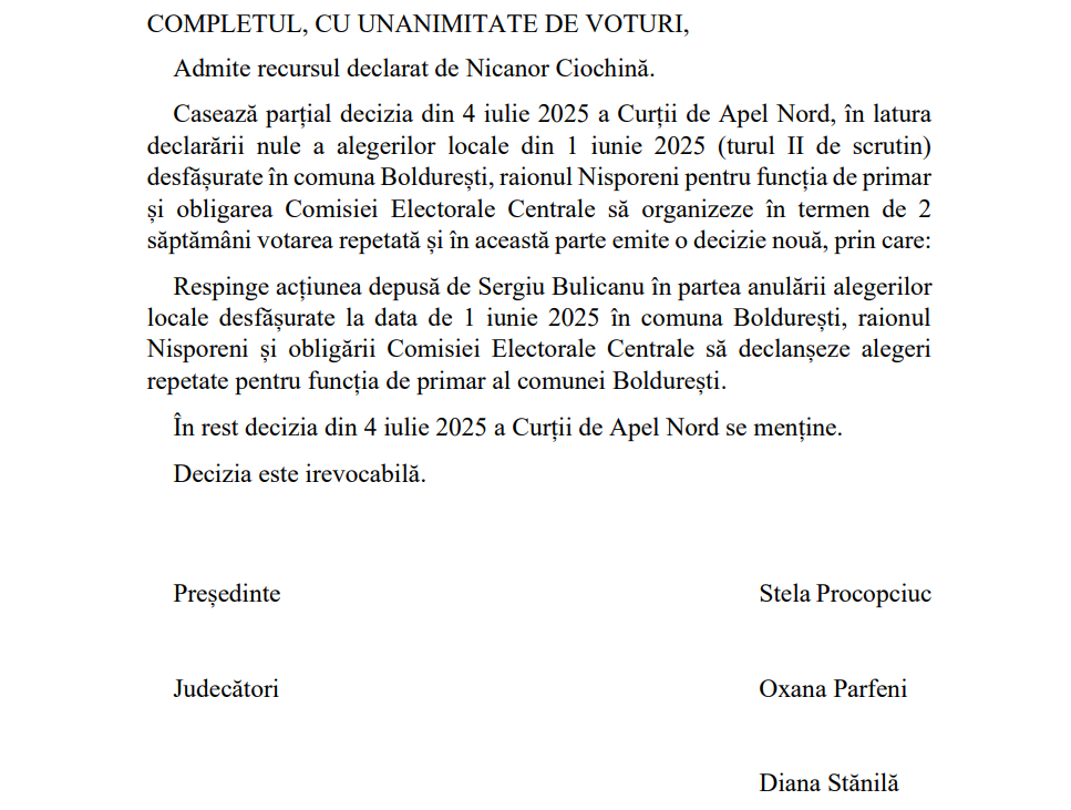 Astfel, CSJ casează parțial decizia din 4 iulie a Curții de Apel Nord, în partea declarării nule a alegerilor locale din 1 iunie 2025 (turul II de scrutin) desfășurate în comuna Boldurești pentru funcția de primar și obligarea CEC să organizeze în termen de 2 săptămâni votarea repetată.