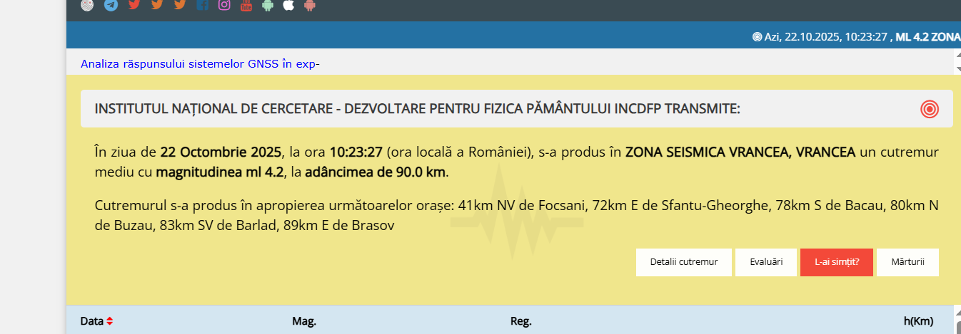 Un cutremur cu magnitudinea de 4.2 s-a produs astăzi în zona seismică Vrancea. Seismul s-a produs la ora 10:23, la la adâncimea de 90.0 km.