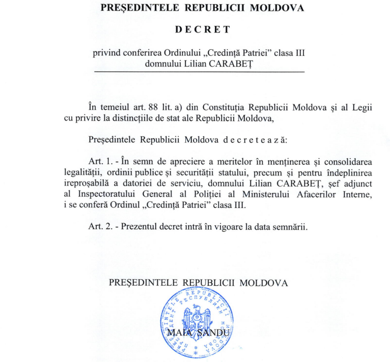 Președinta Republicii Moldova, Maia Sandu, a semnat două decrete prin care a conferit distincții conducerii Inspectoratului General al Poliției. Astfel, șeful IGP, Viorel Cernăuțeanu, a primit gradul special de chestor-șef. Adjunctul său Lilian Carabeț a fost decorat cu Ordinul „Credință Patriei” clasa III.