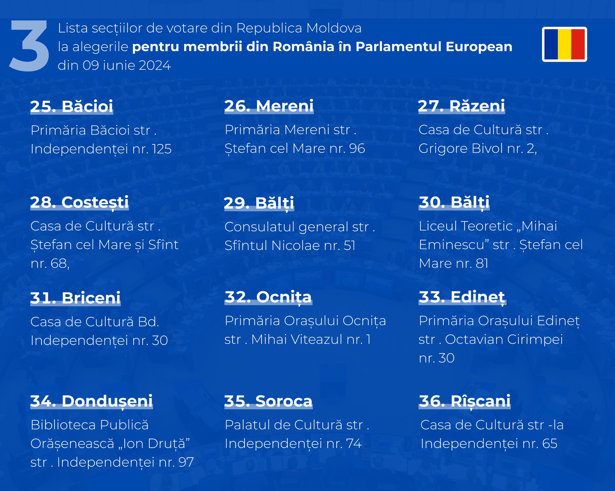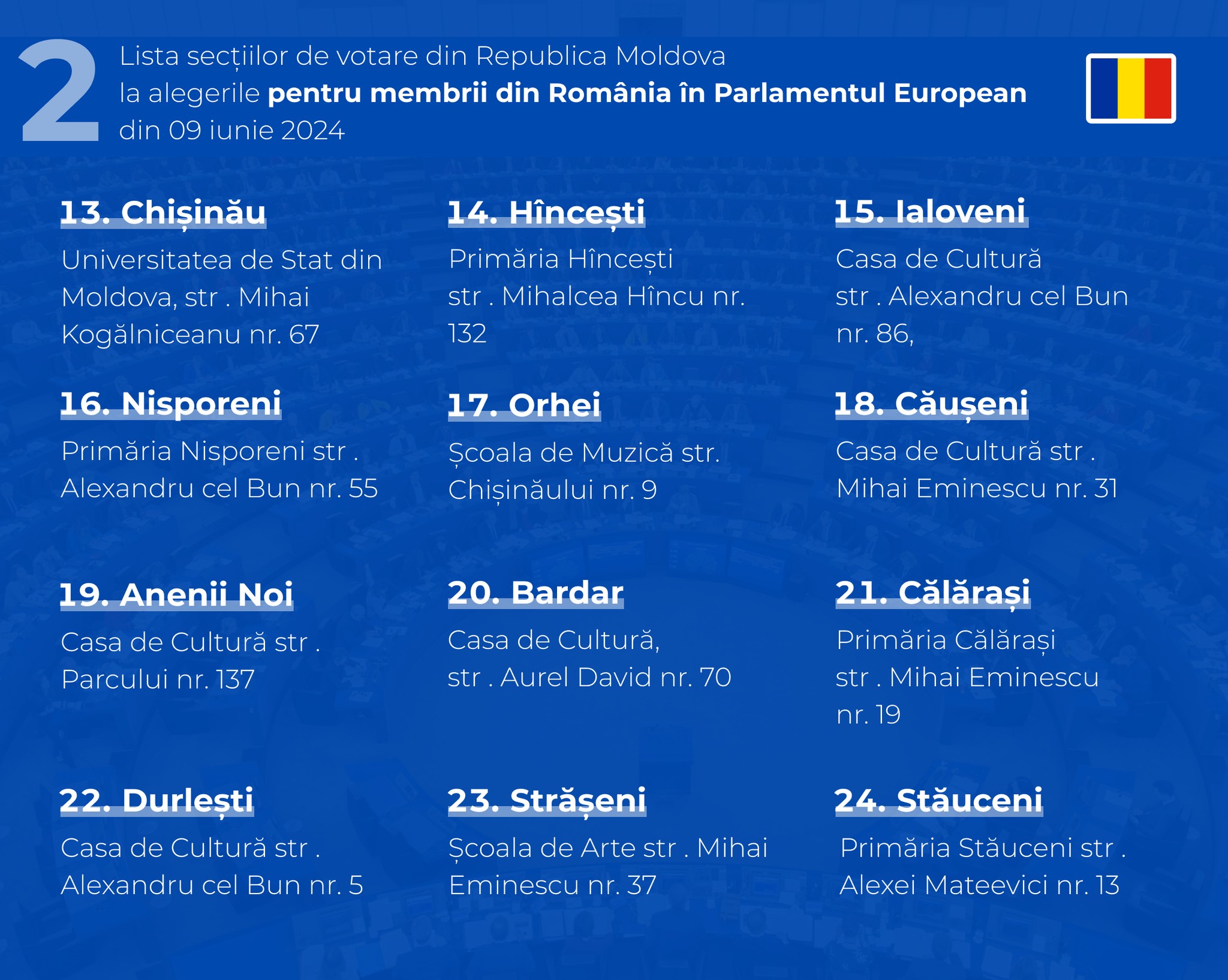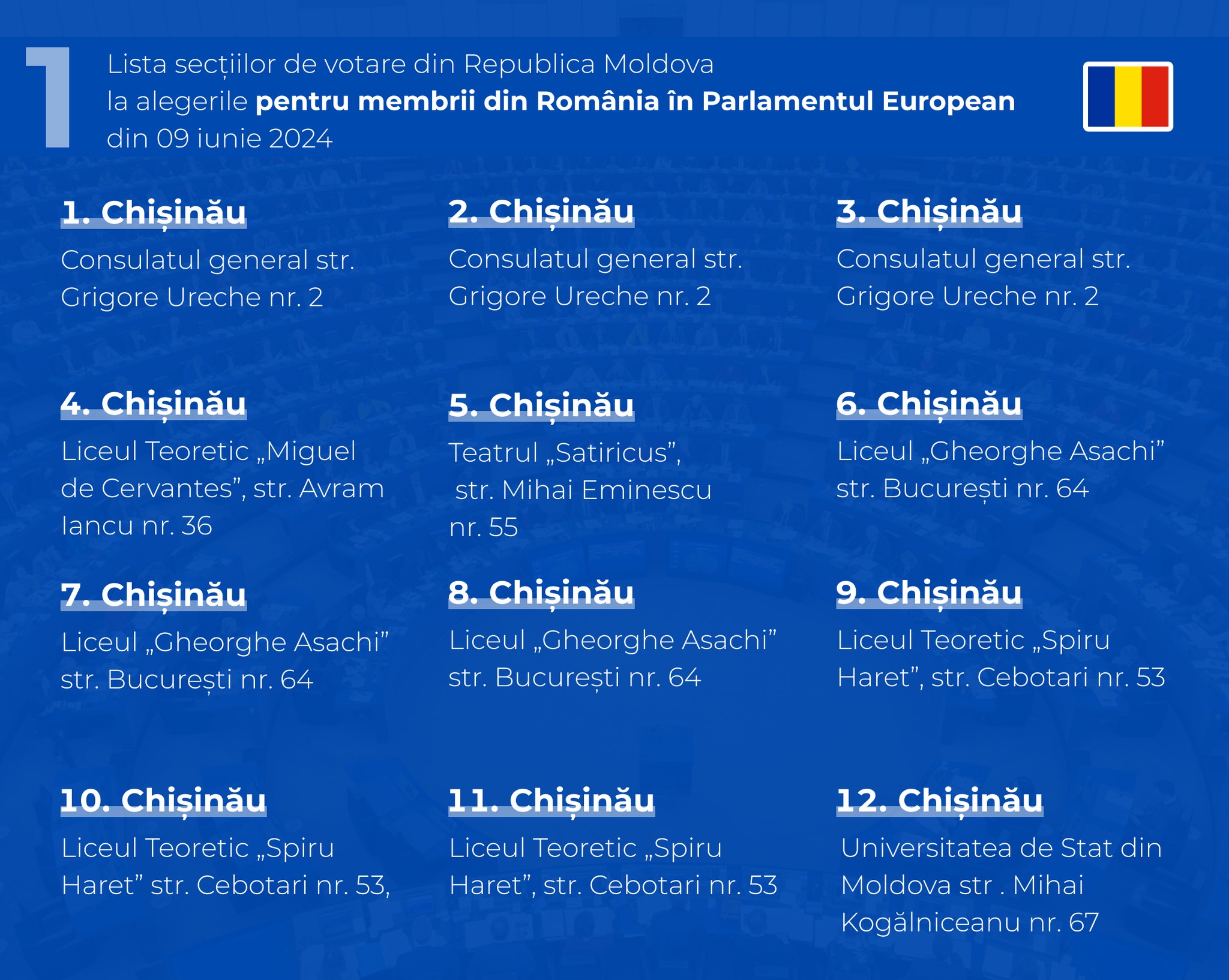 Toți cetățenii Republicii Moldova care dețin cetățenia României, Bulgariei, Franței, Poloniei, Letoniei, Ungariei și altor state membre ale Uniunii Europene sunt așteptați să voteze pentru alegerile europarlamentare la secțiile de votare deschise în țara noastră.
