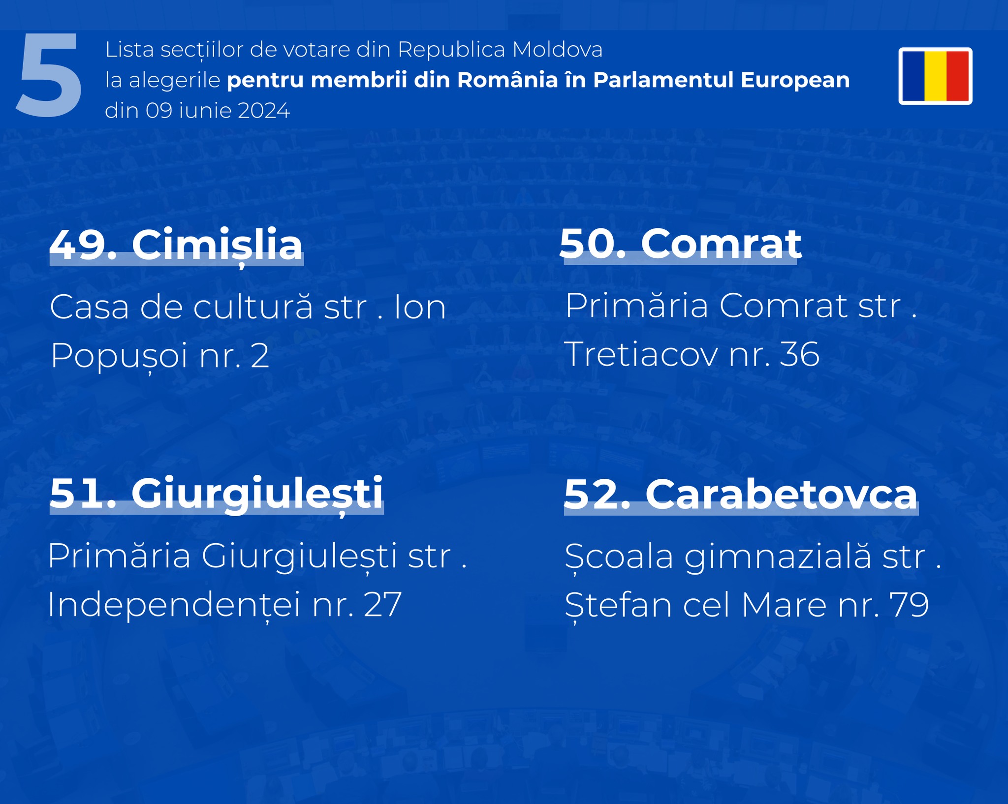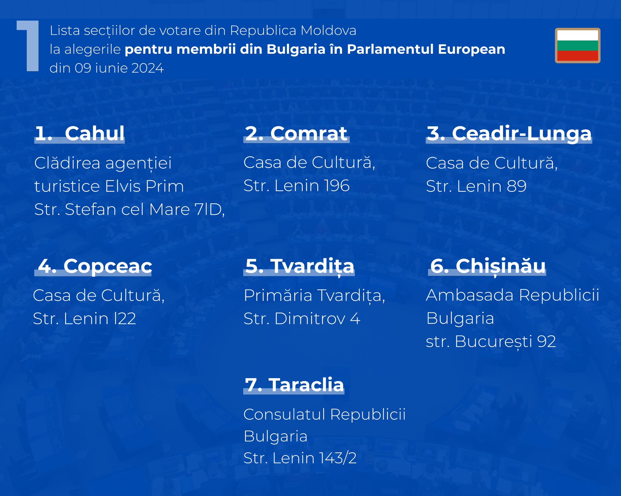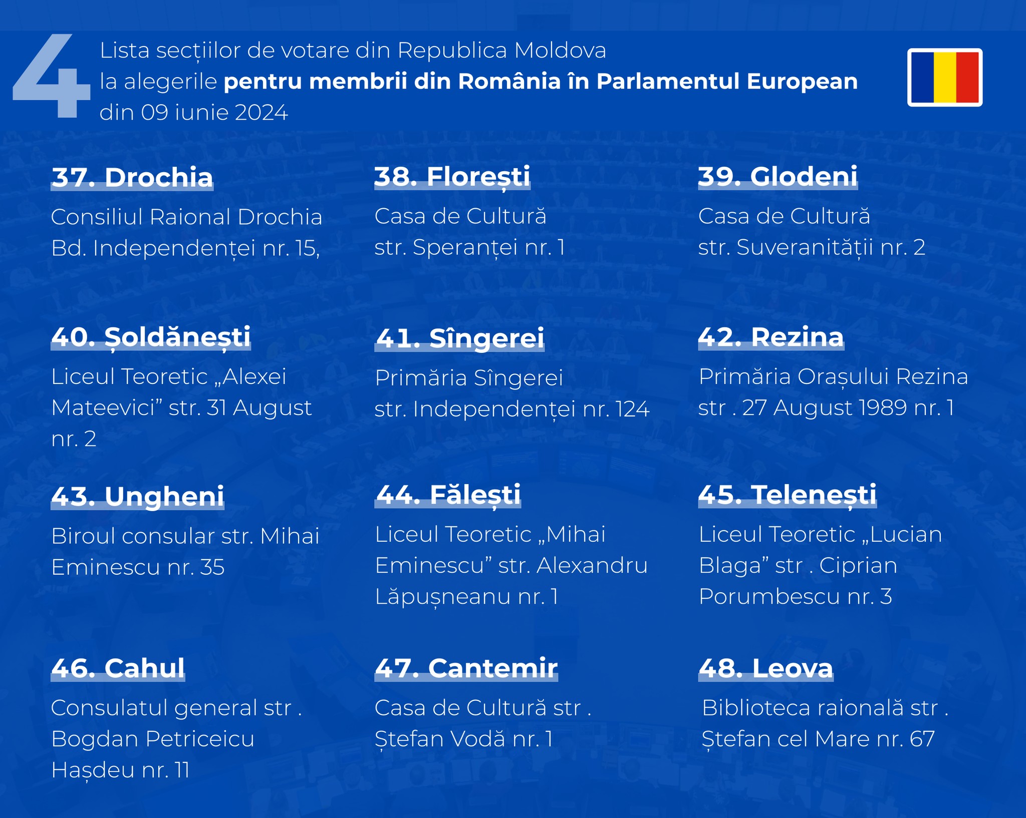 Toți cetățenii Republicii Moldova care dețin cetățenia României, Bulgariei, Franței, Poloniei, Letoniei, Ungariei și altor state membre ale Uniunii Europene sunt așteptați să voteze pentru alegerile europarlamentare la secțiile de votare deschise în țara noastră.
