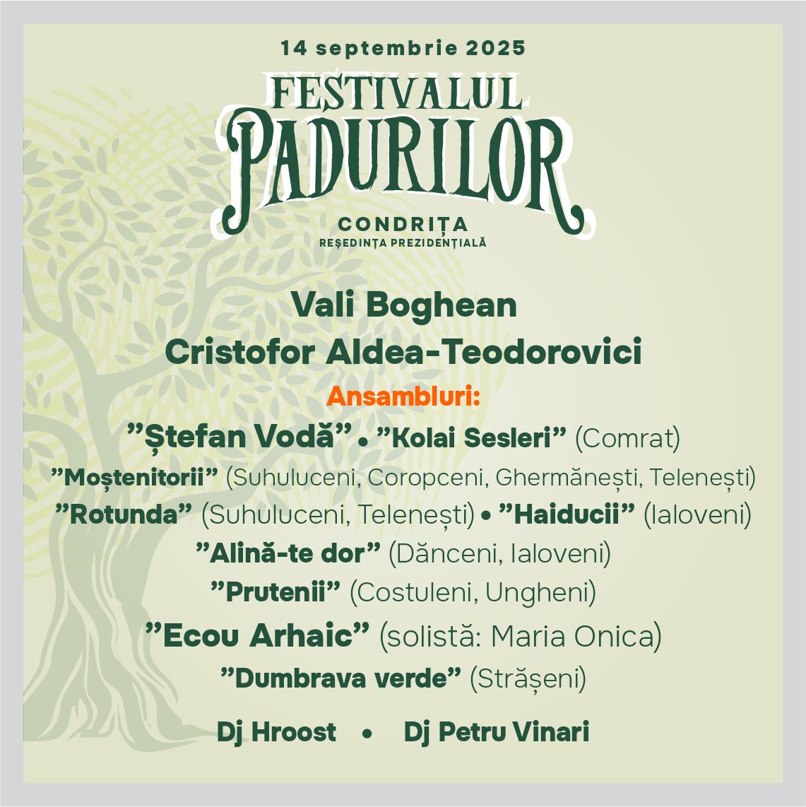 Festivalul Pădurilor 2025 va avea loc duminică, 14 septembrie, la Reședința Prezidențială de la Condrița. Cei care vor merge la eveniment vor avea parte de muzică bună și o atmosferă caldă de sărbătoare. Pe scenă vor urca artiști și ansambluri folclorice din întreaga țară. Printre invitați se numără cunoscuții interpreți Cristofor Aldea-Teodorovici și Vali Boghean. Vor evolua și ansamblurile ”Moștenitorii”, ”Haiducii”, ”Dumbrava verde”, ”Ecou Arhaic ”, dar și altele.
