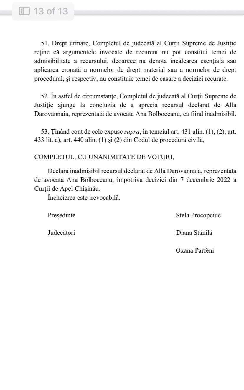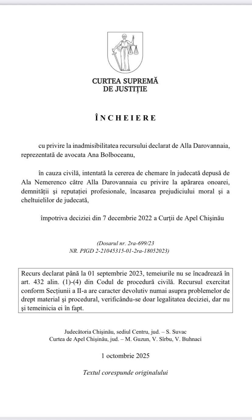 Deputata socialistă Alla Darovannaia a fost obligată de Curtea Supremă de Justiție să își ceară scuze publice de la ministra Sănătății, Ala Nemerenco, în scandalul diplomelor false. Darovannaia a scris o postare pe Facebook, cu mențiunea că face acest lucru „în executarea hotărârii judecătorești irevocabile”.