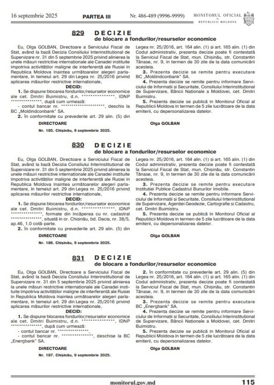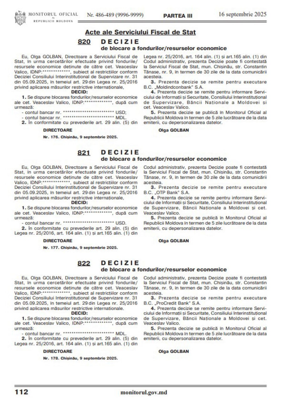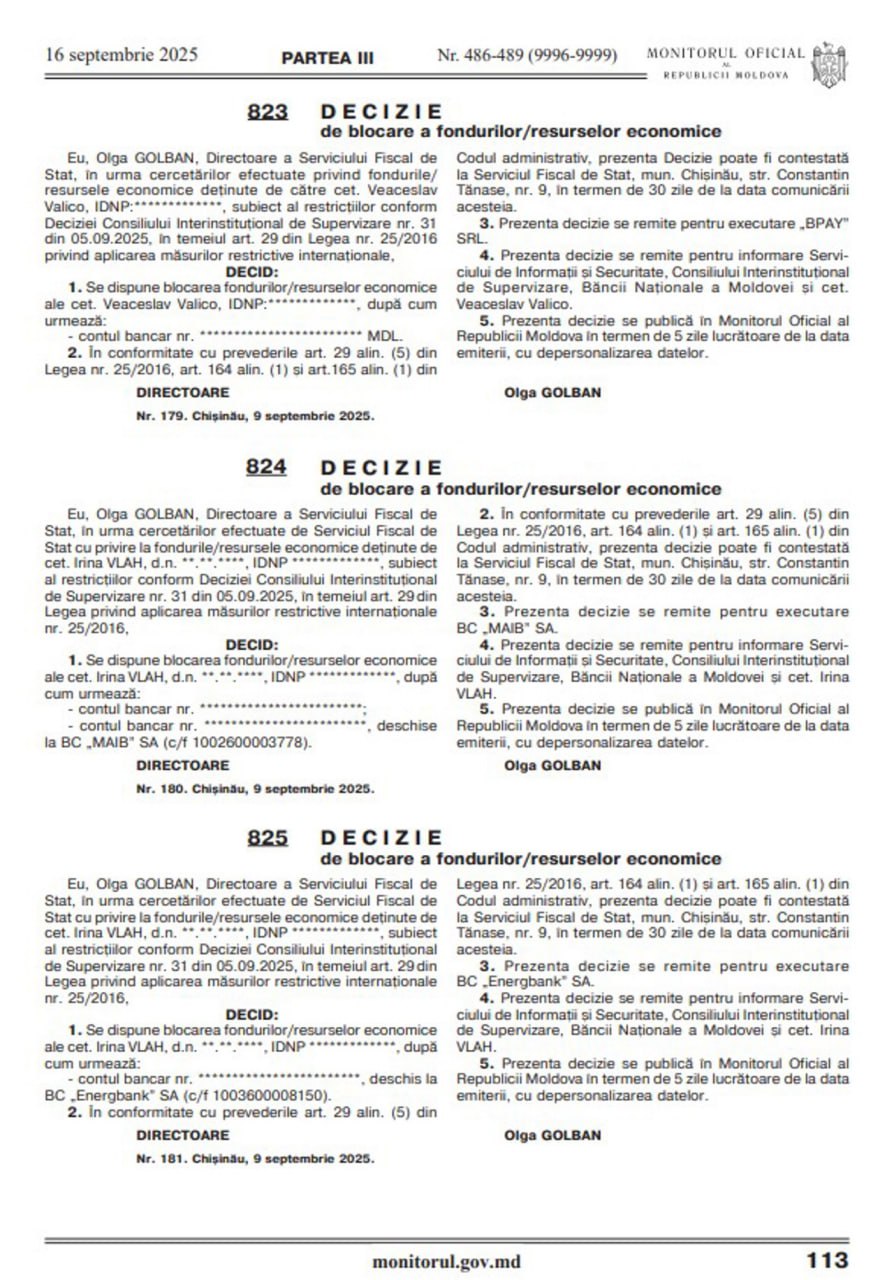 Serviciul Fiscal de Stat a blocat fondurile deținute de fosta bașcană a Găgăuziei, Irina Vlah, Veaceslav Valico și Dmitri Buimistru. Acestea au fost blocate în baza deciziei din 5 septembrie a Consiliului Interinstituțional de Supervizare. Deciziile SFS au fost publicate în Monitorul Oficial.