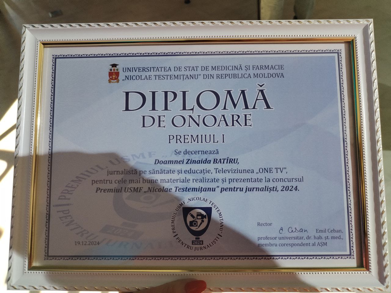 Jurnalista de la postul de televiziune ONE TV, Zinaida Batîru, a fost premiată cu „Diploma de Onoare” și locul I la concursul organizat de Universitatea de Stat de Medicină și Farmacie „Nicolae Testemițanu” din Republica Moldova, în cadrul Galei Studenților Laureați 2024. Evenimentul a fost organizat de instituție în colaborare cu Asociația Studenților și Rezidenților în Medicină din Moldova.