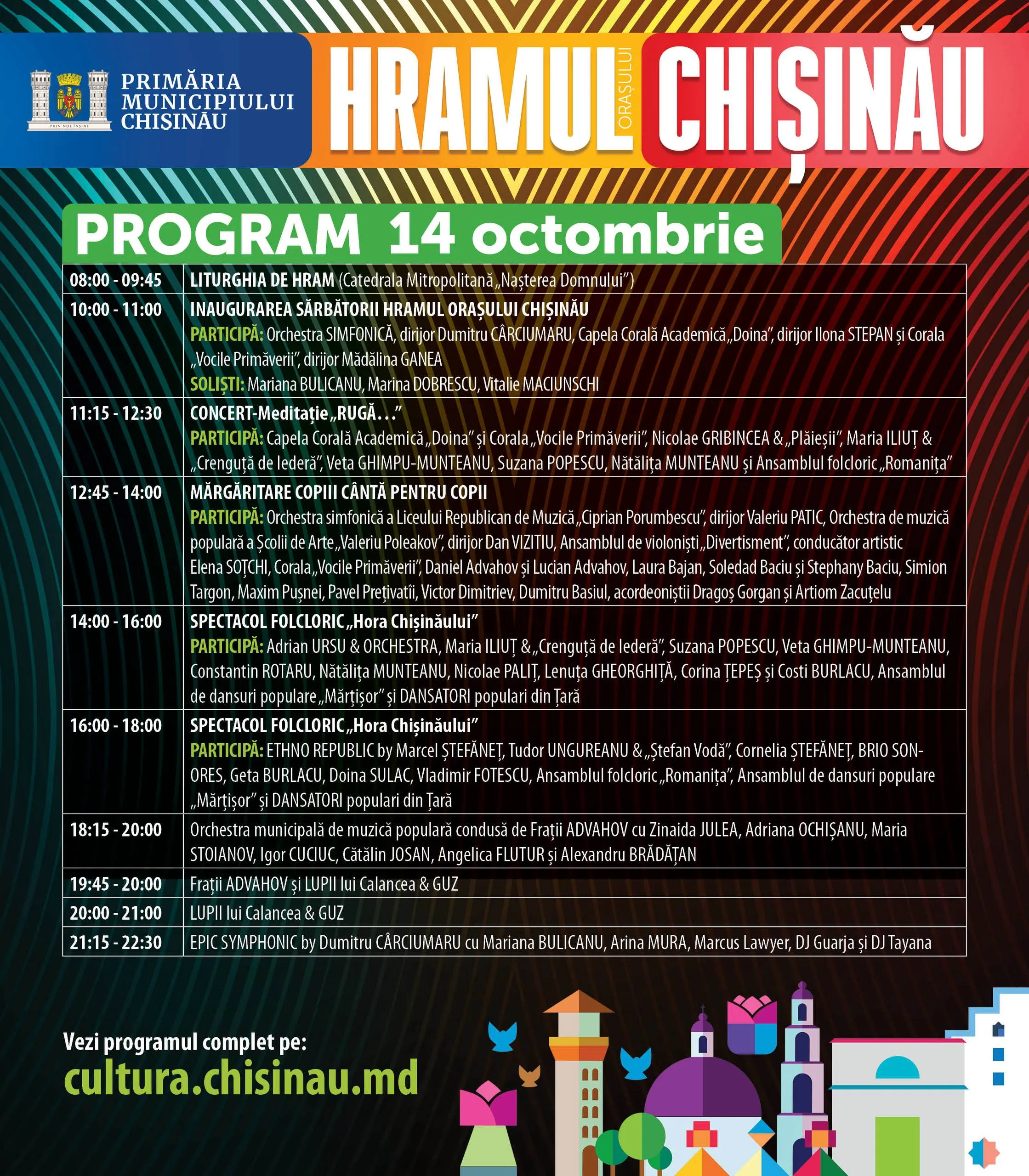 Locuitorii şi oaspeţii Capitalei sărbătoresc astăzi Hramul oraşului Chişinău. Anul acesta, sărbătoarea este marcată printr-un program amplu de activități religioase și artistice. Evenimentul a început la ora 08:00 cu liturghia de Hram la Catedrala Mitropolitană „Nașterea Domnului”.