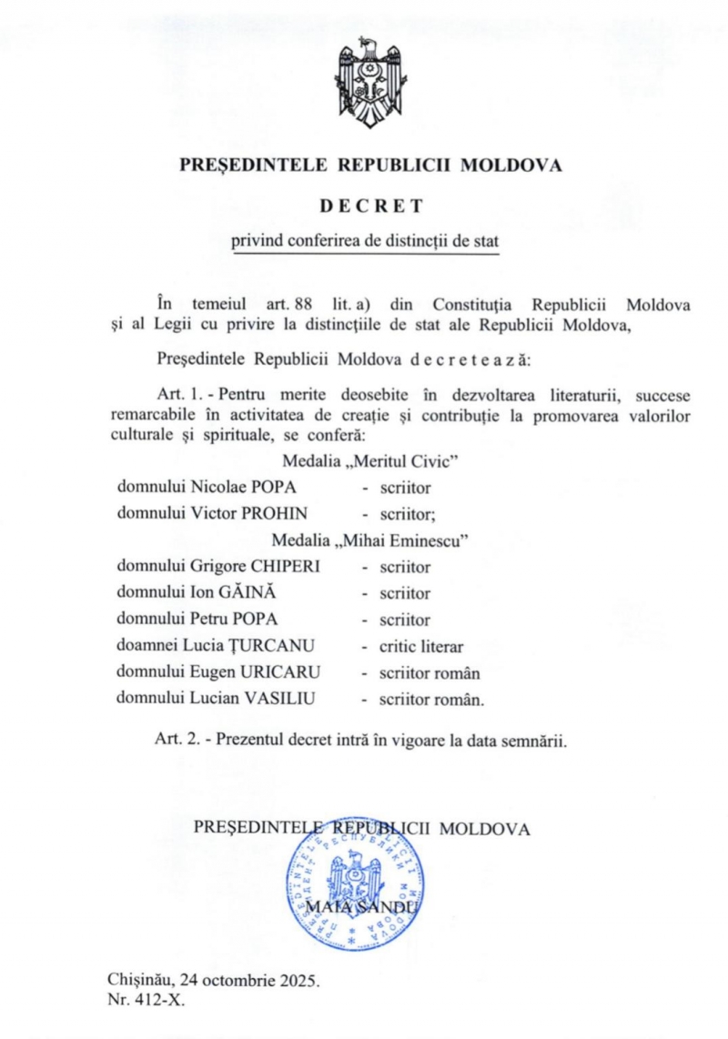 Mai mulți scriitori și critici literari au fost decorați cu distincții de stat de președinta Maia Sandu. Un decret în acest sens a fost semnat pe 24 octombrie. Acestea au fost conferite pentru succese remarcabile în activitatea de creație, contribuția la promovarea valorilor culturale și spirituale ale țării. Dar și pentru aportul la consolidarea identității culturale a Republicii Moldova.