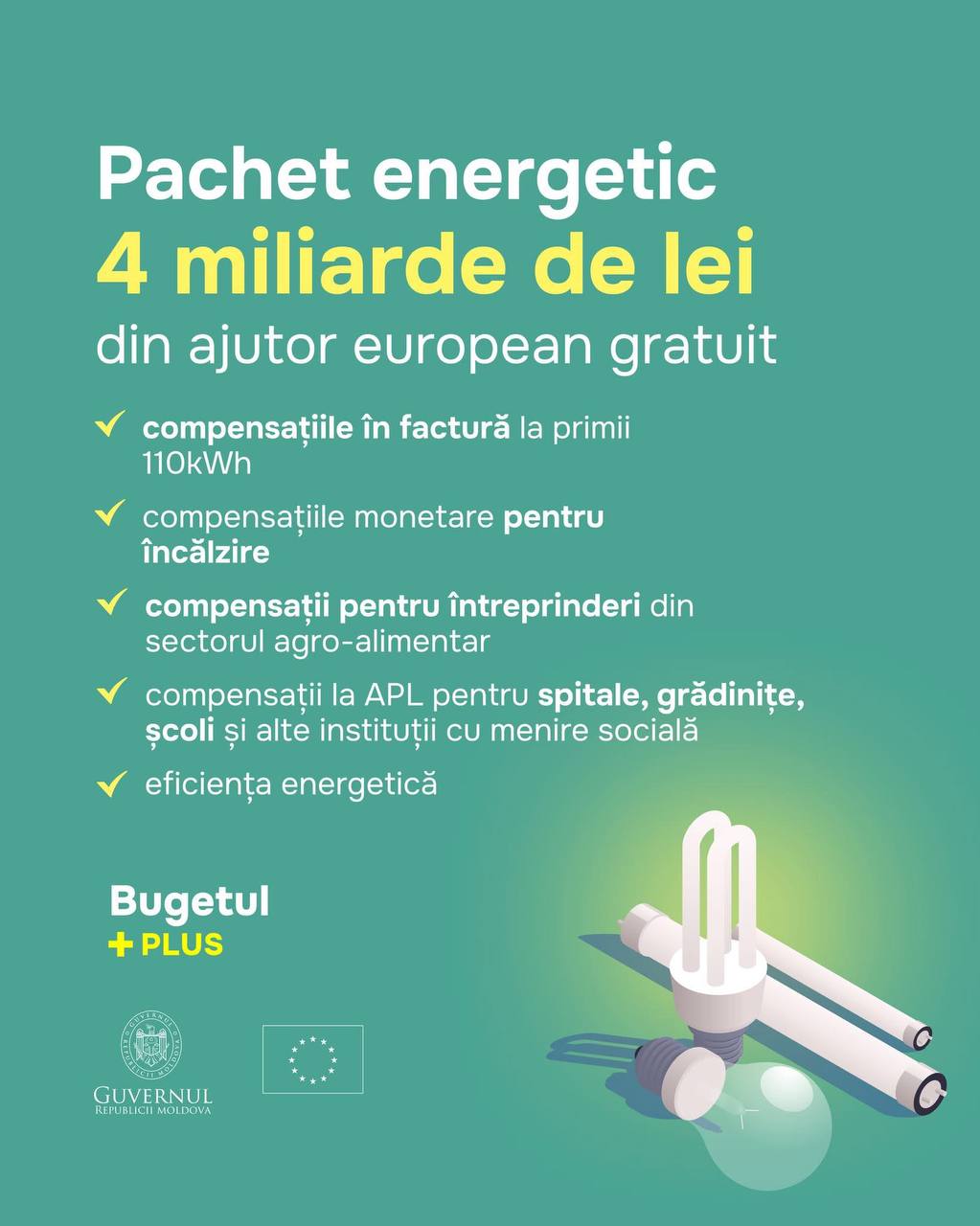 Componenta energetică include prelungirea compensațiilor în factură pentru primii 110 kWh consumați lunar, ajutoare financiare pentru încălzire în sezonul rece, sprijin pentru întreprinderile din sectorul agroalimentar, precum și compensarea costurilor pentru instituțiile publice – școli, grădinițe, spitale.