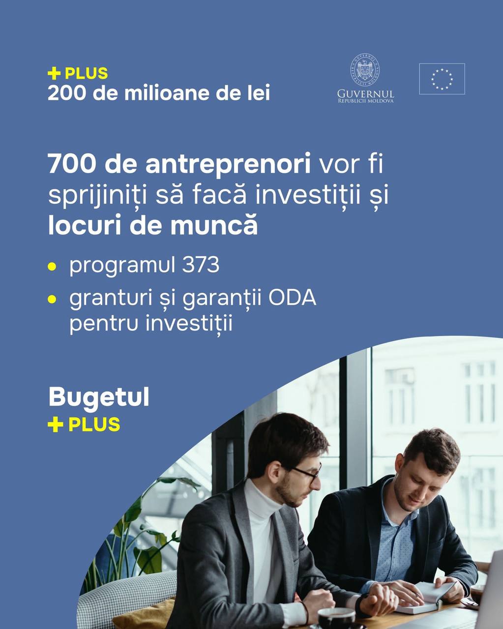 În paralel, Guvernul va sprijini financiar 700 de antreprenori, va oferi subvenții în valoare de 200 de milioane de lei pentru agricultori și va susține tinerii aflați la primul loc de muncă printr-un supliment de 3.000 de lei la salariu.