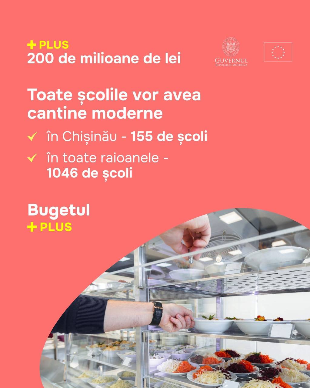 Alte 200 de milioane de lei vor merge către modernizarea cantinelor din școli, astfel încât, începând cu 1 septembrie 2025, elevii din gimnazii să beneficieze de alimentație gratuită.