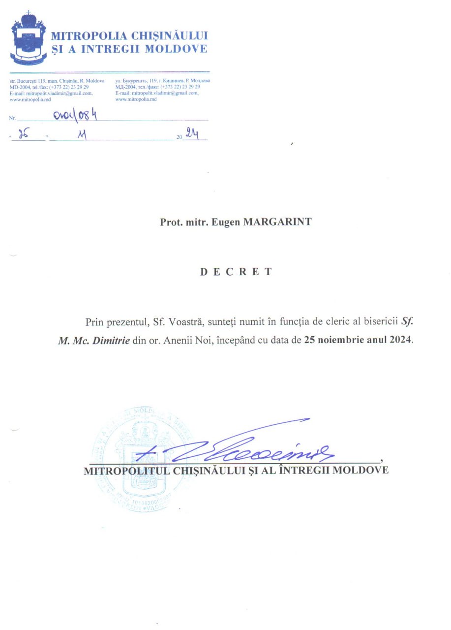 În locul său, Mitropolia l-a numit pe prot. mitr. Eugen Margarint ca nou cleric al bisericii din Anenii Noi, începând cu aceeași dată.