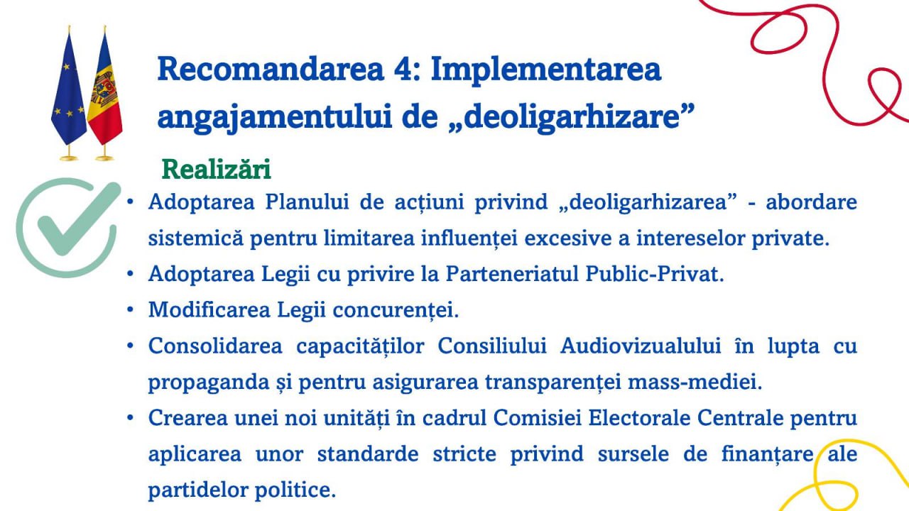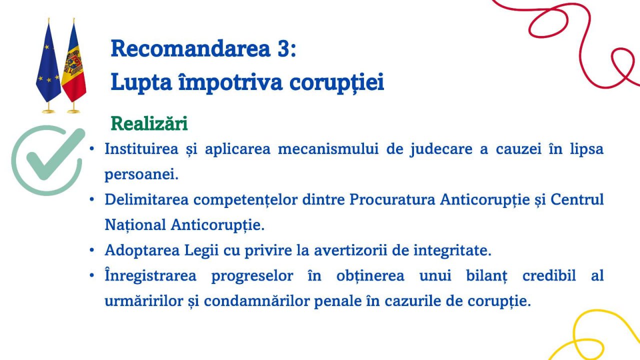 De asemenea, în document se arată a fost îmbunătățită lupta cu corupția, anume prin modificarea anumitor legi, cum ar fi judecarea în lipsa persoanei, deoligarhizarea, lupta cu propaganda la televizor, crimei organizate, reforma administrației publice, finalizarea reformei gestionării publice și consolidarea protecției drepturilor omului.
