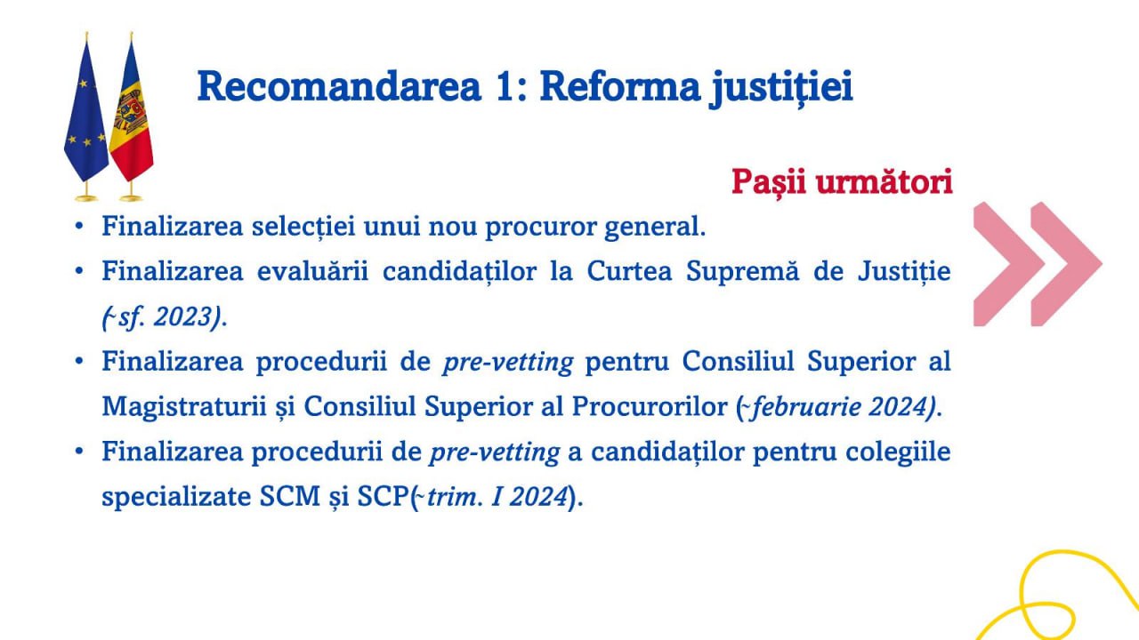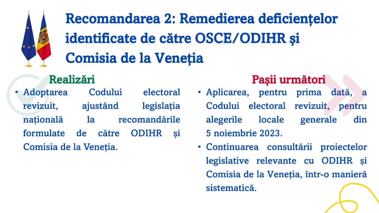 Primele reforme au fost realizate în domeniul justiției, ajustând legea în conformitate cu recomandările de la Veneția, dar și aplicarea consecventă a controalelor de integritate. Urmează selectarea noului procuror general, finalizarea procedurii de pre-vetting pentru Consiliul Superior al Magistraturii etc. Următoarea reformă realizată este adoptarea Codului Electoral revizuit, dar și aplicarea lui în premieră la următoarele alegeri locale.