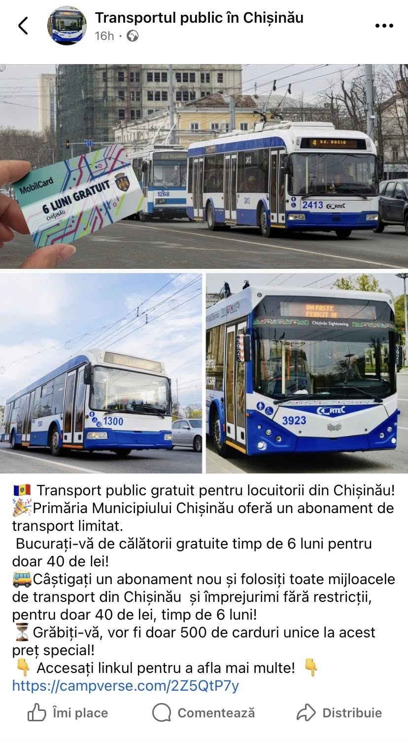 „Nu accesați linkurile sau paginile neoficiale care promit carduri, abonamente sau reduceri. Acestea pot reprezenta tentative de fraudă online”, avertizează Regia Transport Electric Chișinău.