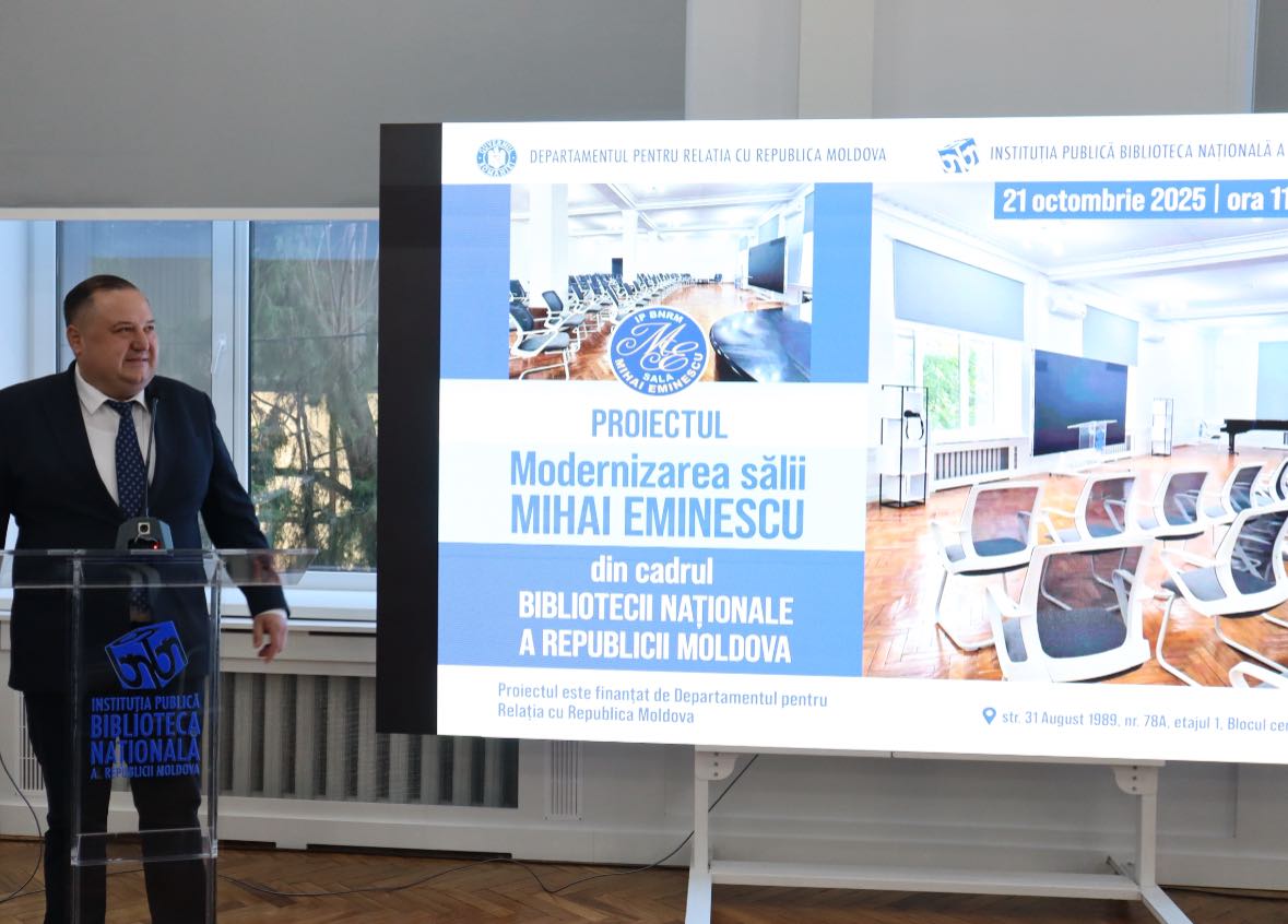 Un nou spațiu pentru cultura românească prinde viață la Chișinău, cu sprijinul Departamentul pentru Relația cu Republica Moldova din cadrul Guvernului României. Biblioteca Națională a inaugurat Sala „Mihai Eminescu”, un spațiu modern și multifuncțional. Proiectul a vizat dotarea sălii cu tehnologii moderne, sistem audio performant, echipamente de proiecție, iluminat scenic și infrastructură pentru evenimente transmise online.