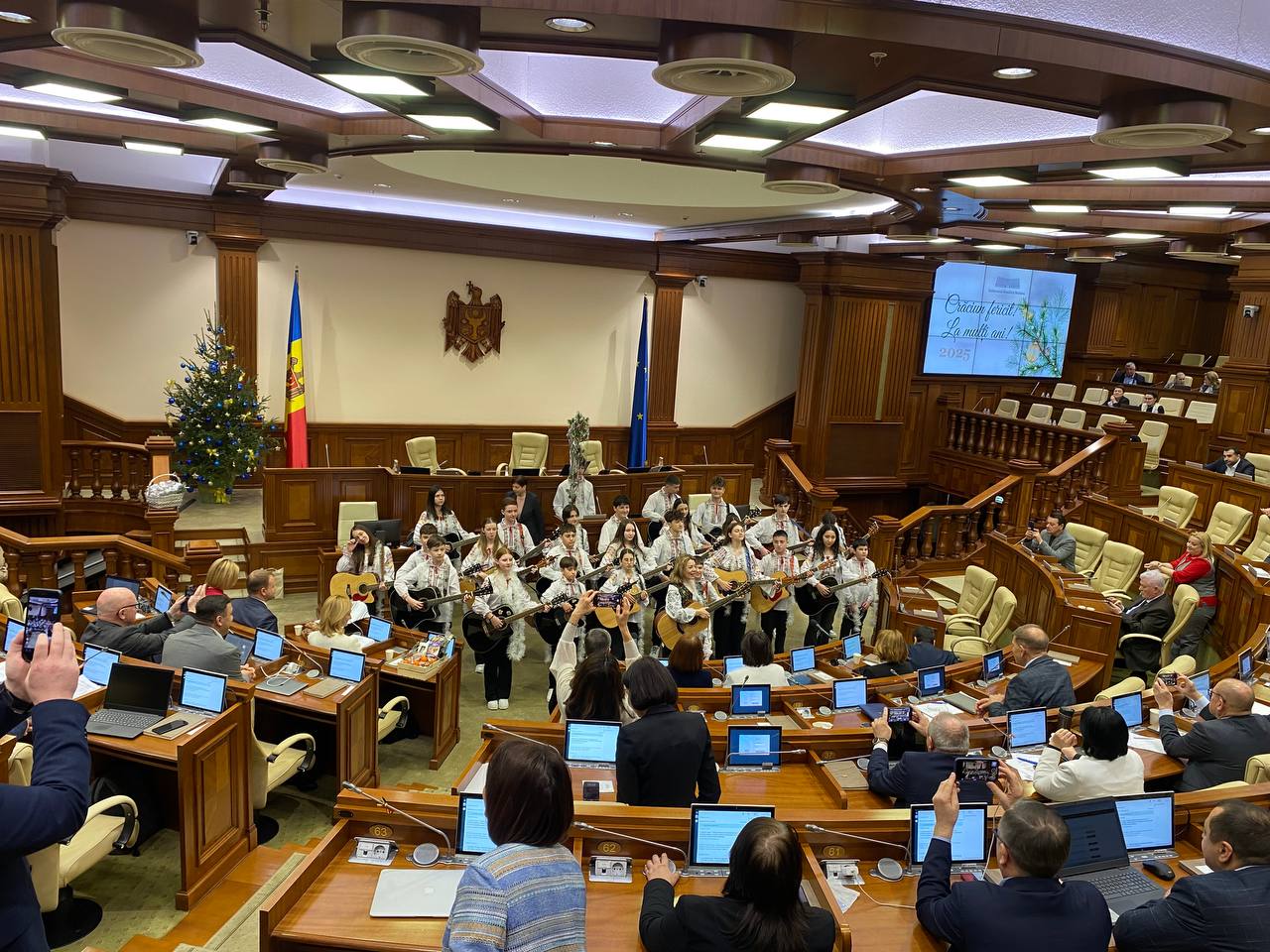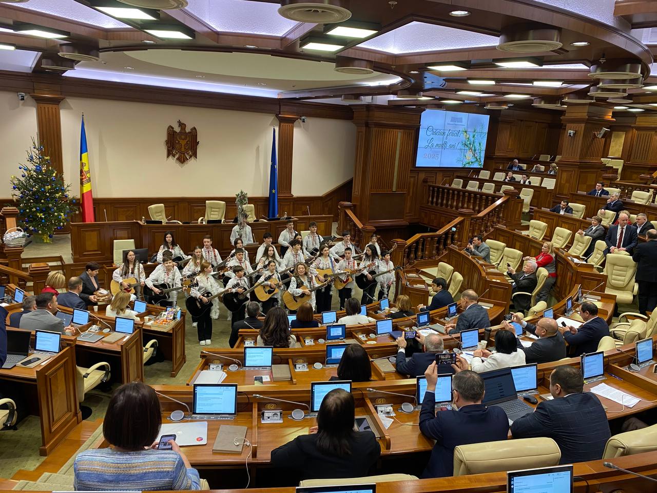 Parlamentul Republicii Moldova a încheiat anul într-o atmosferă festivă, cu colinde, urături și cântece tradiționale. Deputații și angajații legislativului au fost colindați și urați de zeci de colindători, care au adus în plen spiritul sărbătorilor de iarnă. Primii care au deschis programul festiv au fost membrii ansamblului „Frunza Nucului” din satul Inești, raionul Telenești.