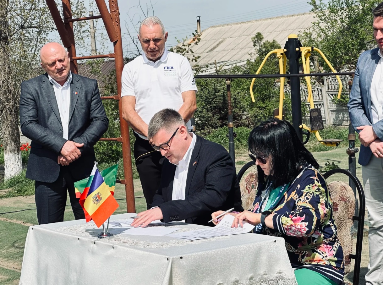 Acordul de finanțare a noului proiect de infrastructură sportivă a fost semnat de către ambasadoarea Bulgariei în Moldova, Maya Dobreva și președintele de onoare al A.S.I.C.S., Plamen Milanov, în prezența legendei fotbalului bulgar, Hristo Stoichkov. Fostul star al Barcelonei, deținătorul balonului de aur și al ghetei de aur a pus, alături de semnatari, și capsula simbolică la baza viitorului teren.