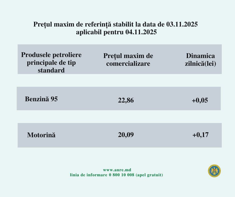 Astfel, mâine benzina va costa 22 de lei și 86 de bani un litru, în creștere cu 5 bani, față de prețul de luni. Motorina se scumpește cu 17 bani și va costa 20.09 bani.