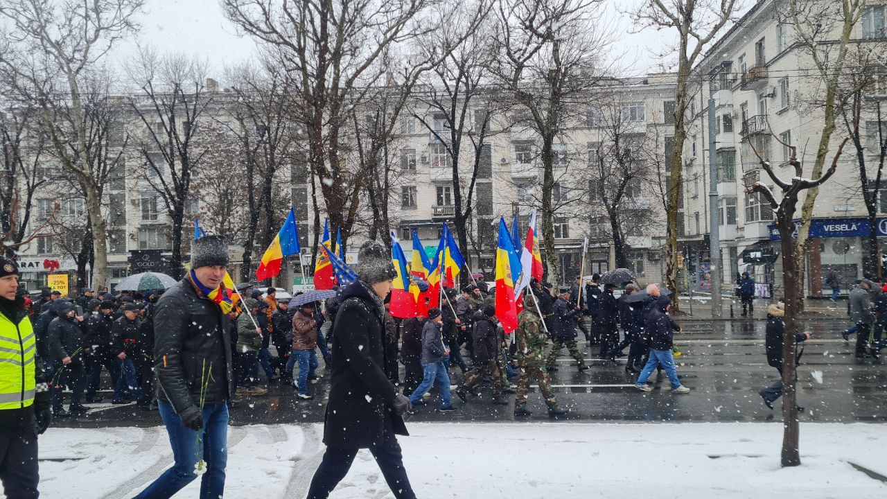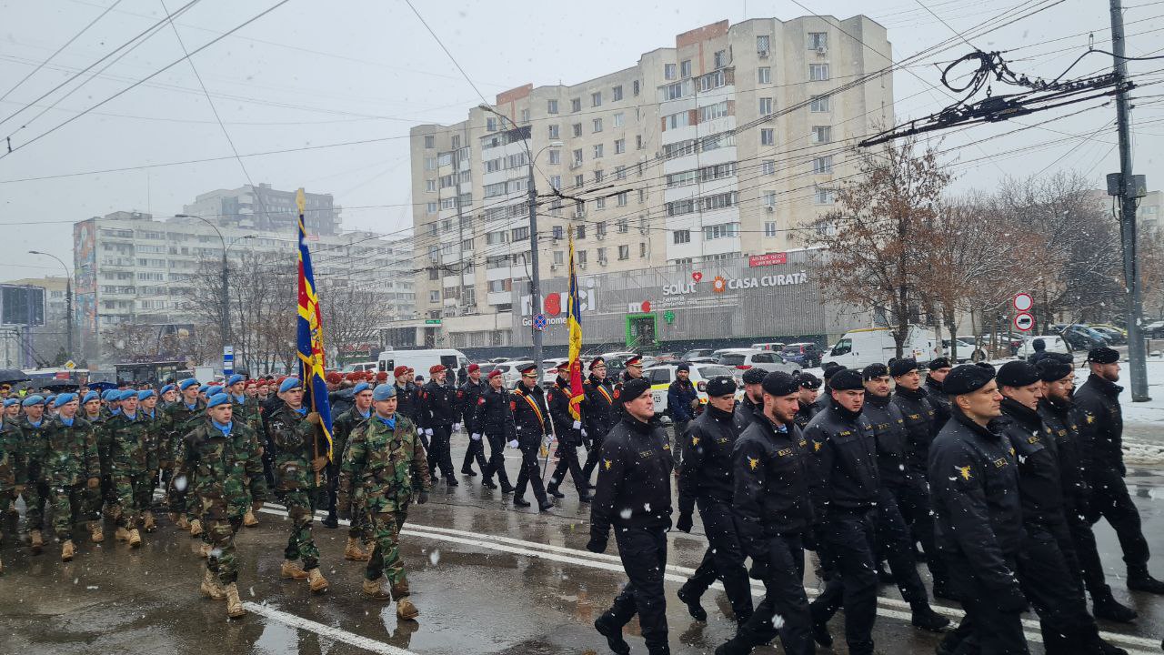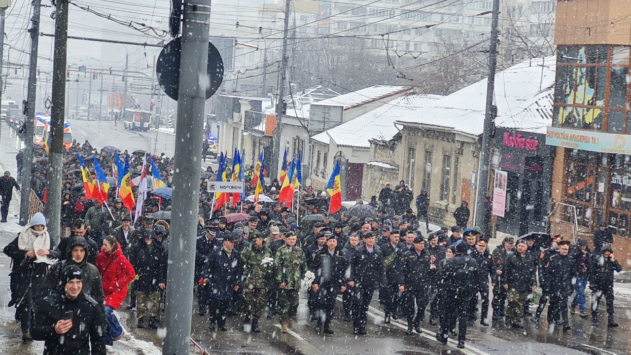 În fruntea coloanei, port-drapelul și Fanfara Militară au deschis cortegiul, în timp ce studenții Academiei de Poliție țin portretele eroilor căzuți în lupte.